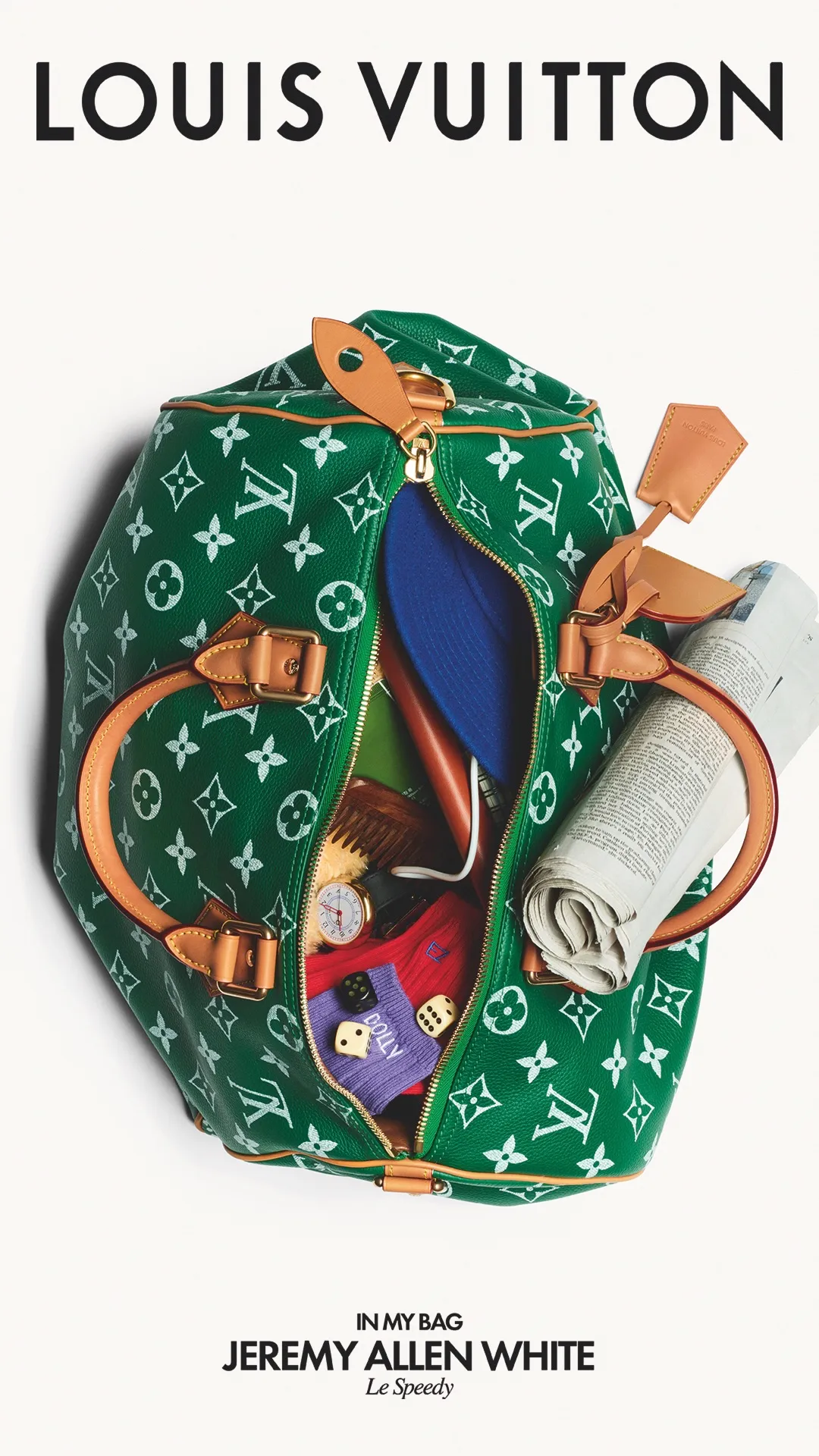 Infine, Jeremy Allen White, noto per il suo lavoro nel cinema e nelle serie TV, interpreta la borsa in modo più quotidiano: dentro ci sono oggetti pratici e personali, come accessori per la cura di sé, appunti e dettagli che richiamano una routine semplice e urbana.