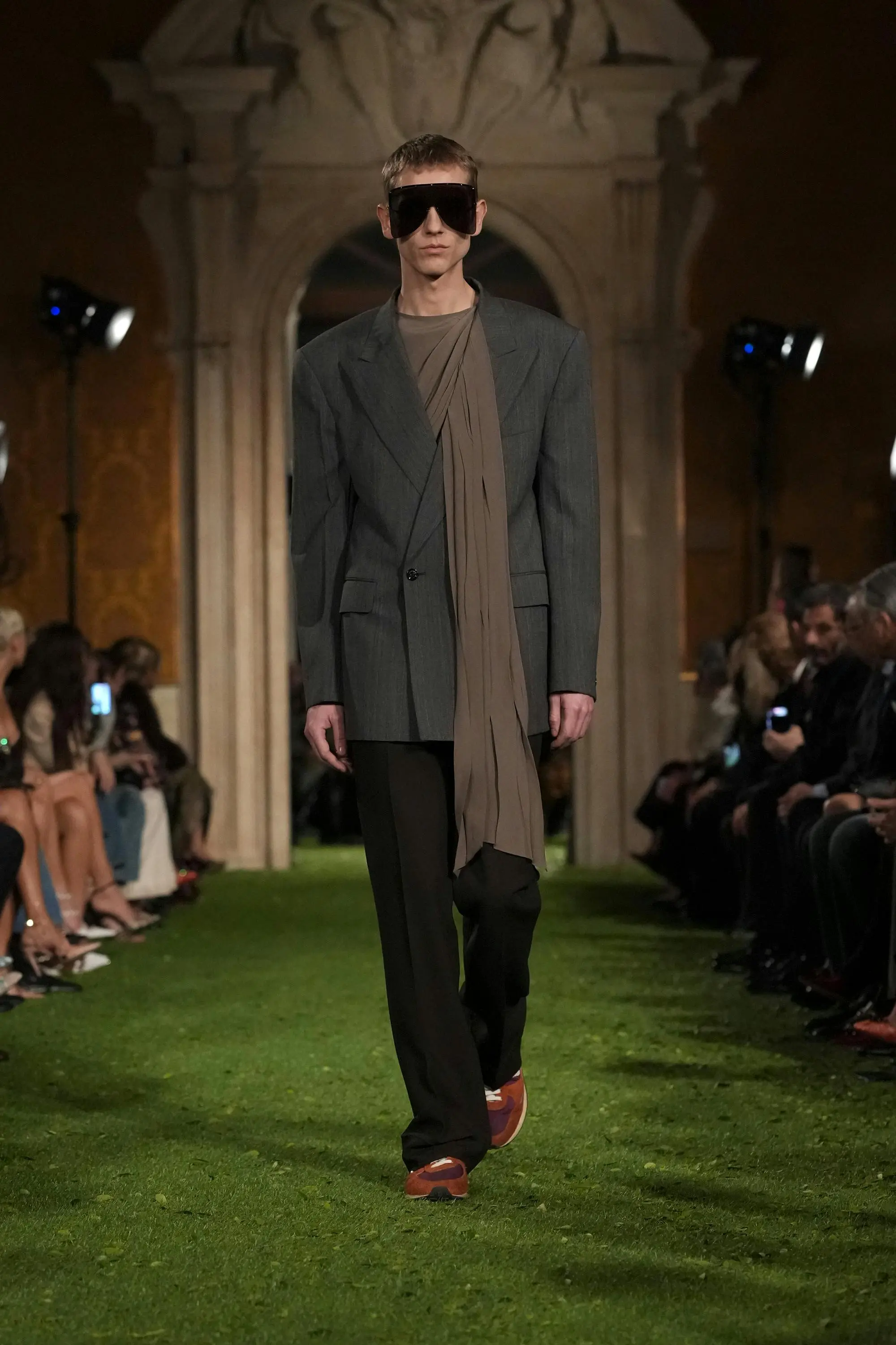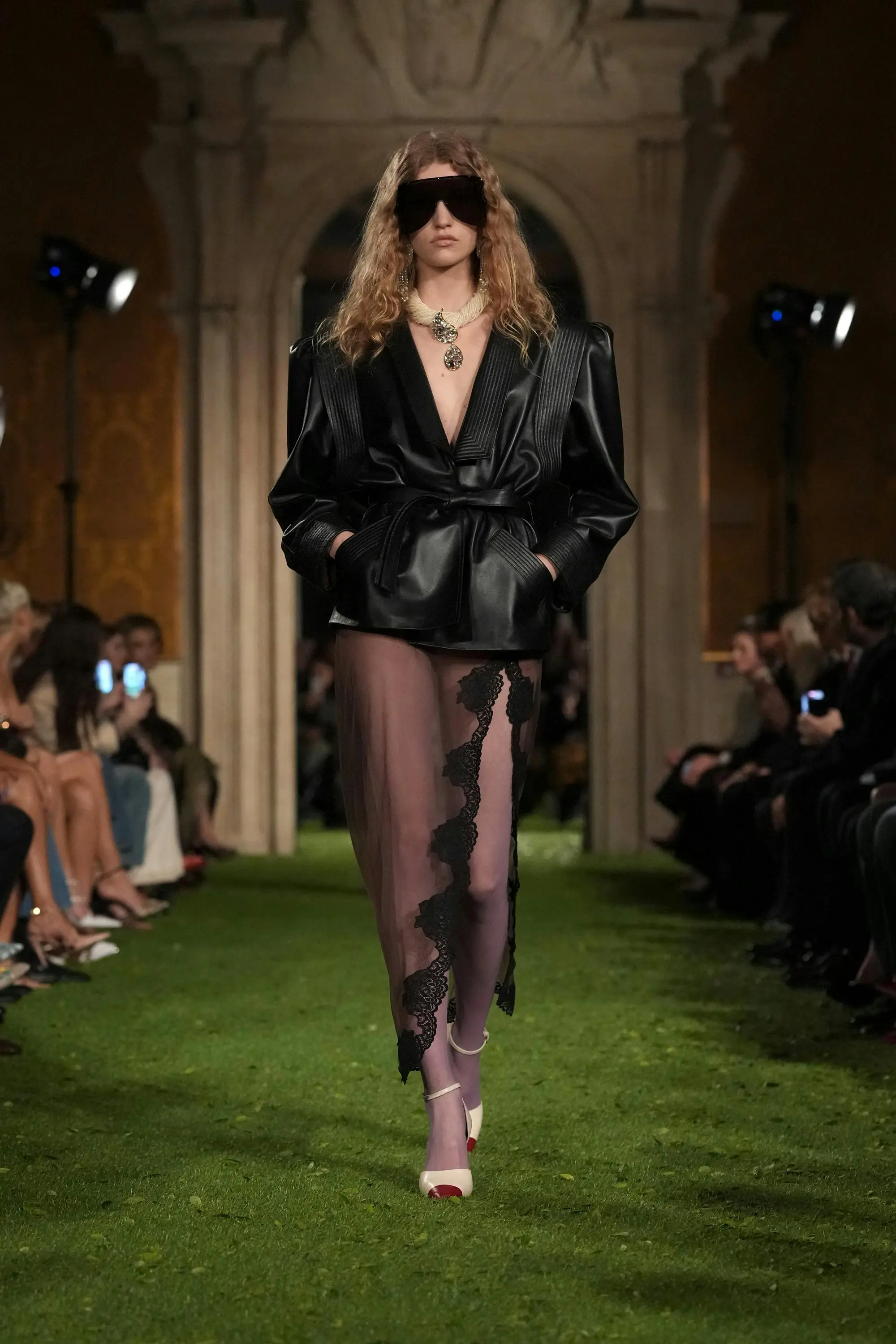 Gli accessori contribuiscono a rafforzare questo linguaggio stratificato: collane di grande impatto, occhiali-visiera oversize, pellicce e gioielli dalle forme scultoree amplificano la costruzione dei look, quasi trasformando la figura in una struttura architettonica.